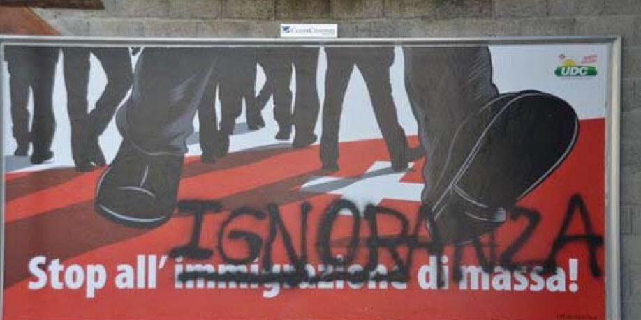 Ancora una volta, facendo capo ad imponenti risorse finanziarie e con la consueta retorica denigratoria, i soliti noti propagandano contenuti e una grafica fascistoidi che schiaffeggiano il buon senso di gran parte della popolazione. Questa offensiva nella nostra regione, caratterizzata da tradizioni antifasciste e di apertura verso lo straniero ed il diverso, non può non preoccupare. Per fortuna non tutti ci stanno. I poster propagandistici affissi nel Mendrisiotto sono stati oggetto di una singolare azione da parte di ignoti, probabilmente giovani che sicuramente dimostrano di saper fare uso del loro libero pensiero: la dicitura xenofoba è stata sostituita con “Stop all’ignoranza di massa”. Li ringraziamo pubblicamente.